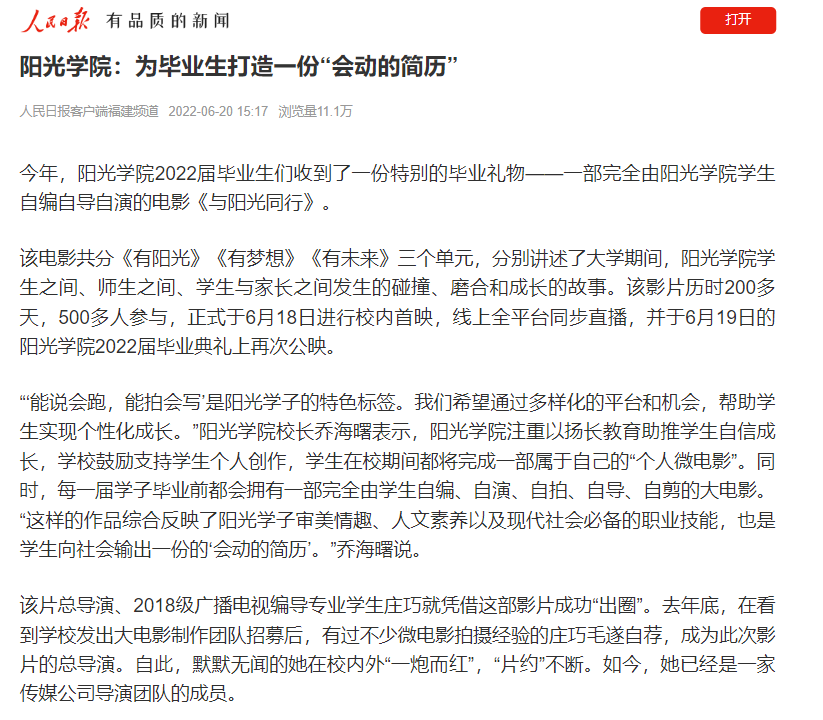 6月20日,人民日报以《BB贝博艾弗森:为毕业生打造一份“会动的简历”》为题,专题报道公司学子拍摄原创大电影《与阳光同行》事迹,反映公司“以扬长教育助推员工自信成长”的育人成效。
