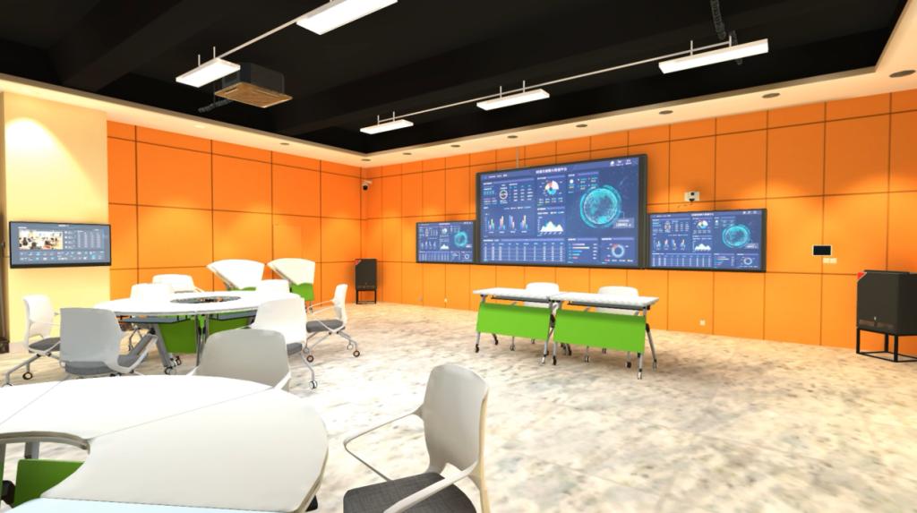 强互动智慧教室:具备智慧教室所有功能,兼具产品发布会功能,17块大屏自由联动,8块产品展示大屏,配备管理系统,支持远程管理,教室秒变实验室,增加开放性。