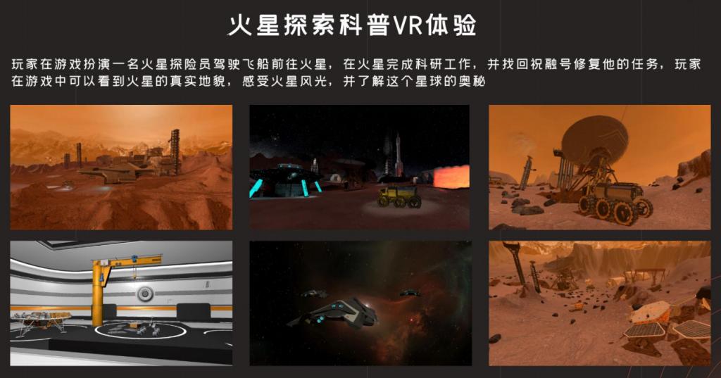 火星科普教育VR产品,实现沉浸式体验加游戏式交互,随时随地进行科普教育!用户扮演一名未来的火星探险员,乘坐飞船前往火星基地,完成火星矿物质的采集并寻找回中国第一个火星车并带回实验室修复的任务,具备一系列体验式、趣味性、可传播的研学方式。严谨科学与趣味艺术创新结合,拓展了航天文化传播的新载体和新触点!能更好的激发全民尤其是青少年崇尚科学、探索未知的热情。