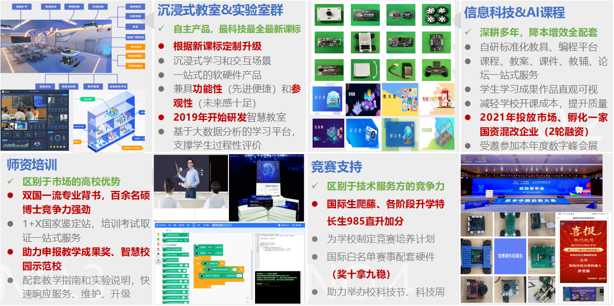 信息科技课程全案包含了沉浸式教室和实验室群规划和建设、团队培训和竞赛支持两大特色服务,以及信息科技&AI课程内容规划等一体化解决方案。