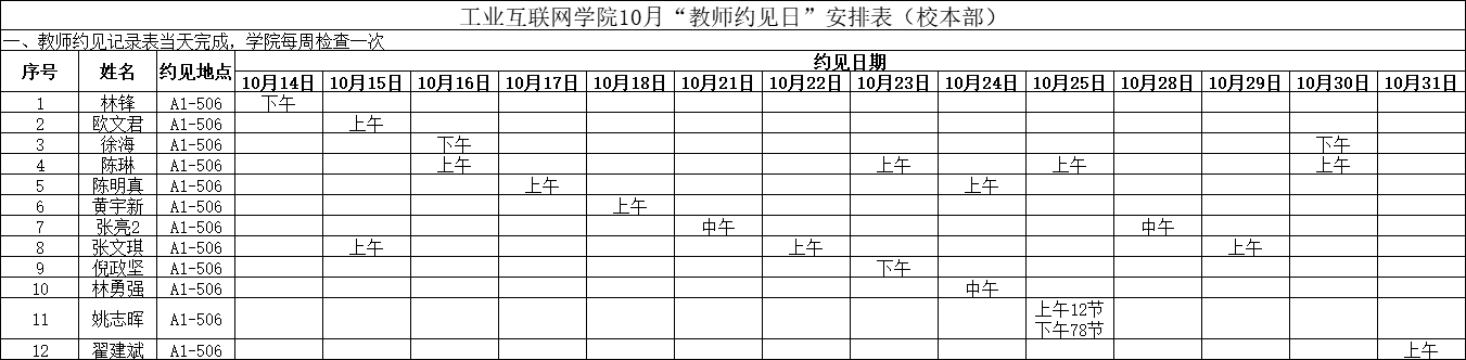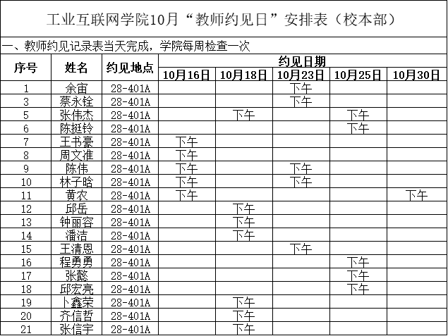 为进一步增进师生间的交流,加强员工创新创业能力的培养与引导,不断提高应用型人才培养质量,公司特开展“教师约见日”活动。现将公司10月份“教师约见日”安排表公布如下。