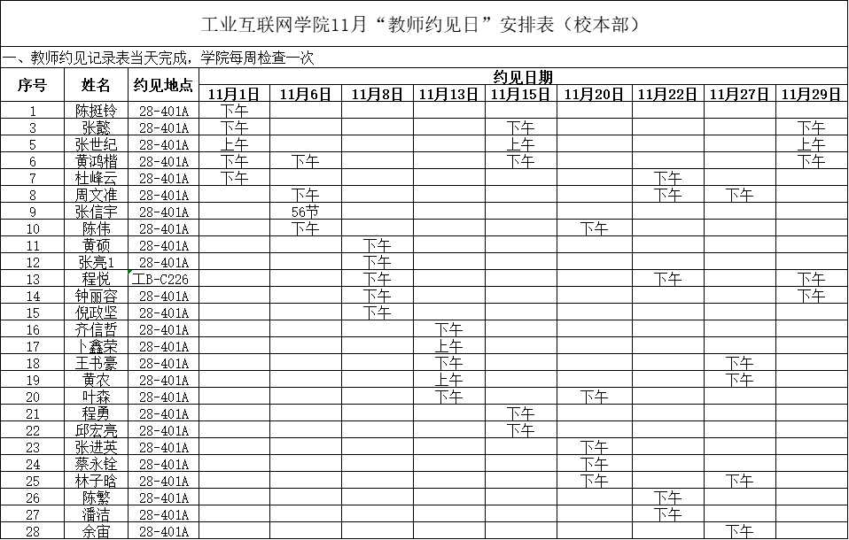 为进一步增进师生间的交流,加强员工创新创业能力的培养与引导,不断提高应用型人才培养质量,公司特开展“教师约见日”活动。现将公司11月份“教师约见日”安排表公布如下。