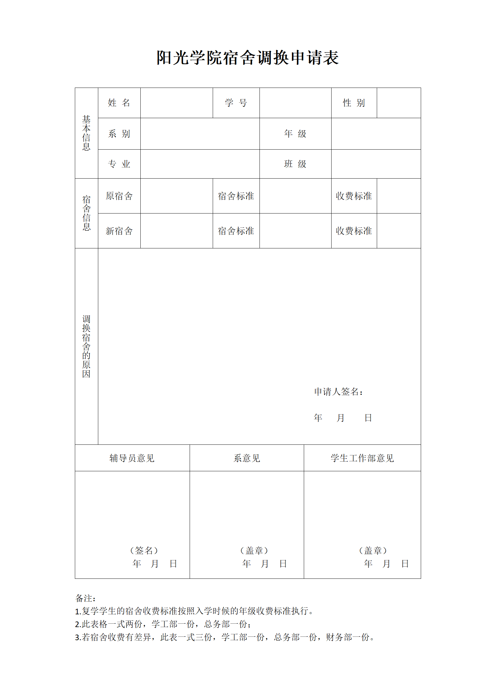 3.若宿舍收费有差异,此表一式三份,学工部一份,总务部一份,财务部一份。