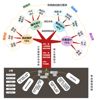 行业前瞻:通过对电子信息行业、产业、企业人才需求调研,重点聚焦嵌入式技术应用领域,确定了硬件设计、软件设计、测试维护和方案设计4个目标岗位,提炼出岗位技能点,构成图谱的“果”。